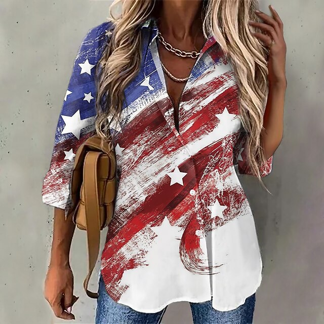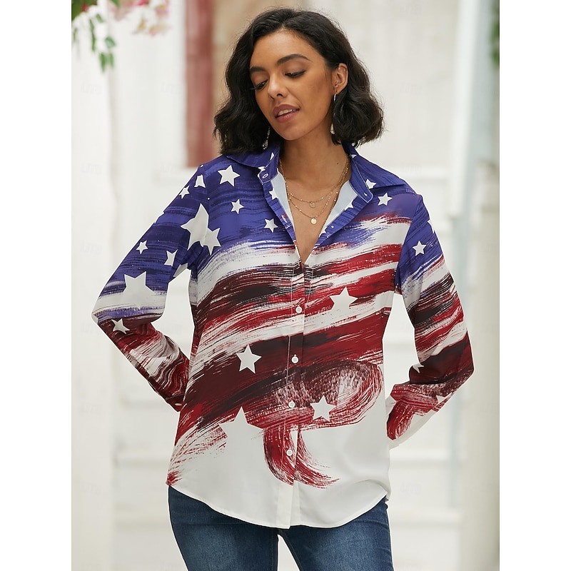 Highlights [Fabric] Crafted from high-quality Faille fabric, this blouse is designed to be lightweight and breathable, ensuring comfort for all-day wear. The material is durable and easy to maintain, making it a practical choice for regular use. [Fit] Featuring a regular fit, this blouse provides a flattering silhouette while allowing ease of movement. Its long sleeves offer additional coverage, making it ideal for changing weather during spring and fall. [Design Highlights] The blouse showcases a classic button-down design with a pointed shirt collar, adding an element of sophistication. Adorned with a vibrant USA national flag print, it captures a patriotic spirit with stylish flair. The 3D print technique enhances its visual appeal, making it a standout piece. [Occasions] Perfect for both daily wear and special events, this shirt is suitable for Independence Day celebrations, casual weekends, and streetwear. It combines versatility with a trendy look, making it a must-have for any wardrobe. [Sizes] Available in a range of sizes from S to 2XL, this shirt accommodates various body types. It is designed to offer a comfortable fit for women looking to express their style with a touch of patriotism.