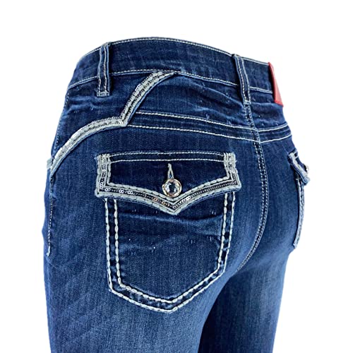 Women's Stretch Embroidered Sequins Stone Crystal Flap Back Pocket Slim Skinny Denim Jeans Pants 7