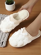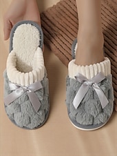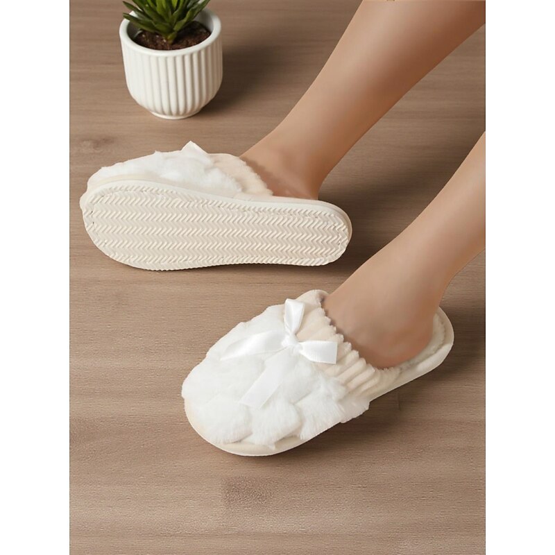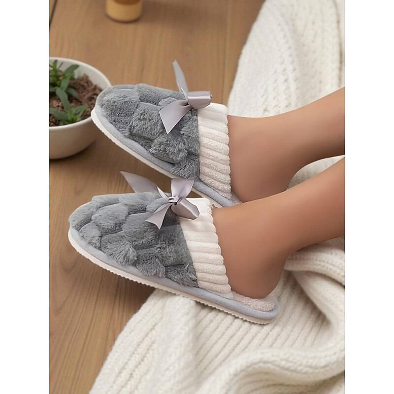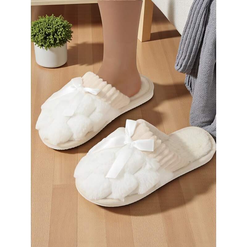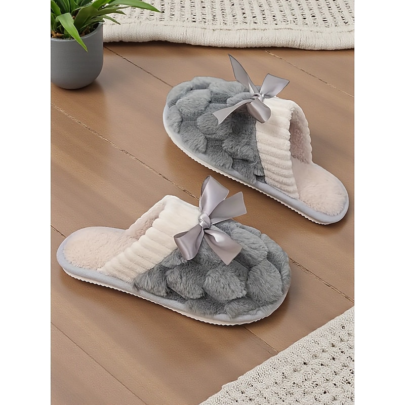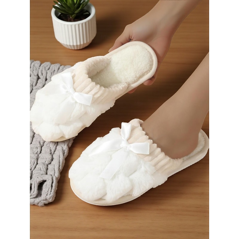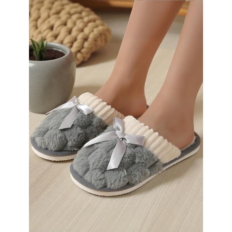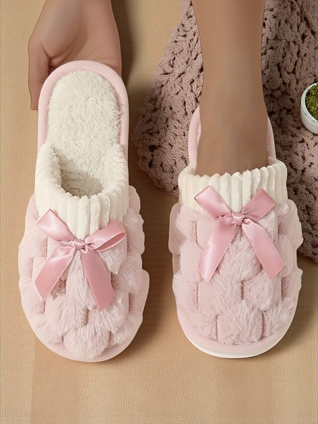 HOT ! Women's Pink Plush House Slippers – Furry Indoor Winter Slippers with Satin Bow for Bedroom, Lounge and Cozy Home Wear