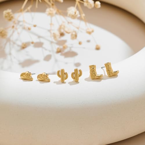 MUYAN Gold Small Western Earrings for Women Trendy Hat Boots Cactus Studs 3 Pairs Country Style Jewelry Cowgirl Outfit Accessories 1