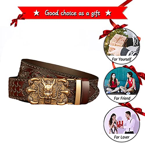 • 【Intricate Dragon Buckle Design】Features a striking dragon automatic gold buckle with western cowboy-inspired carved floral prints on the brown leather strap, creating a bold vintage statement for dress or casual wear.
