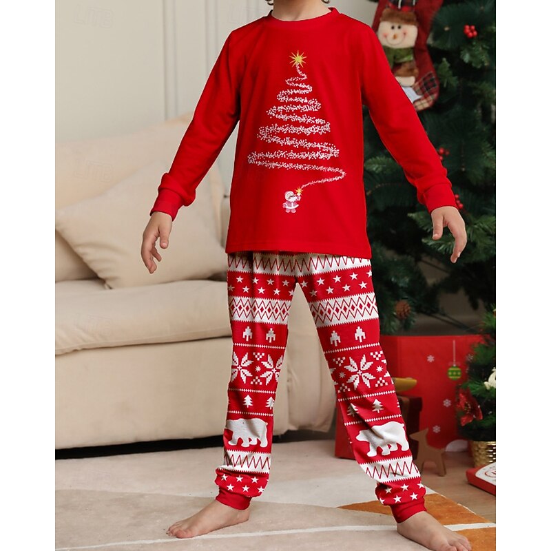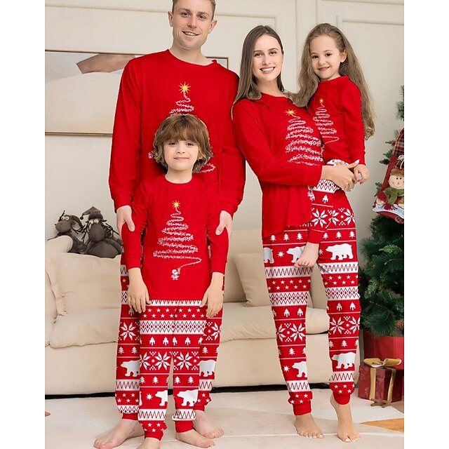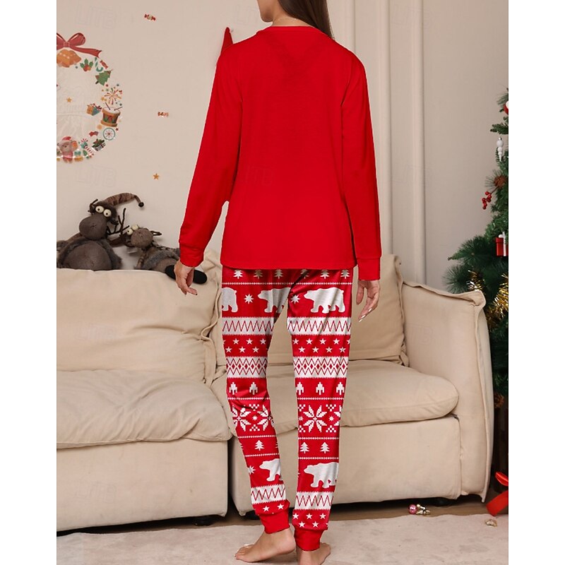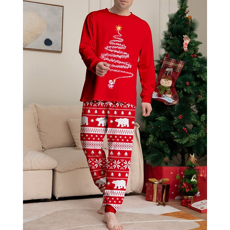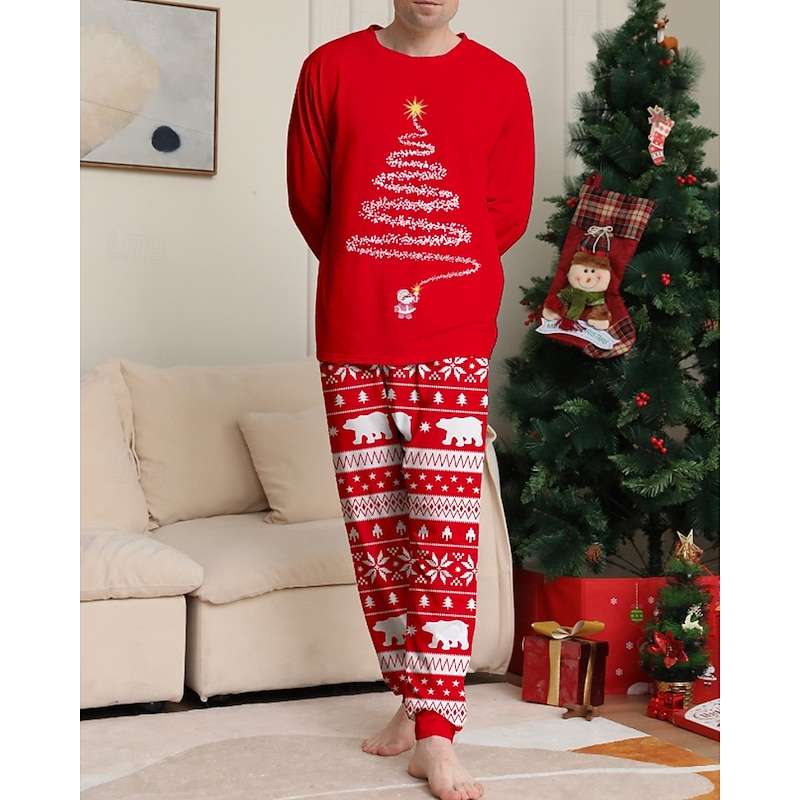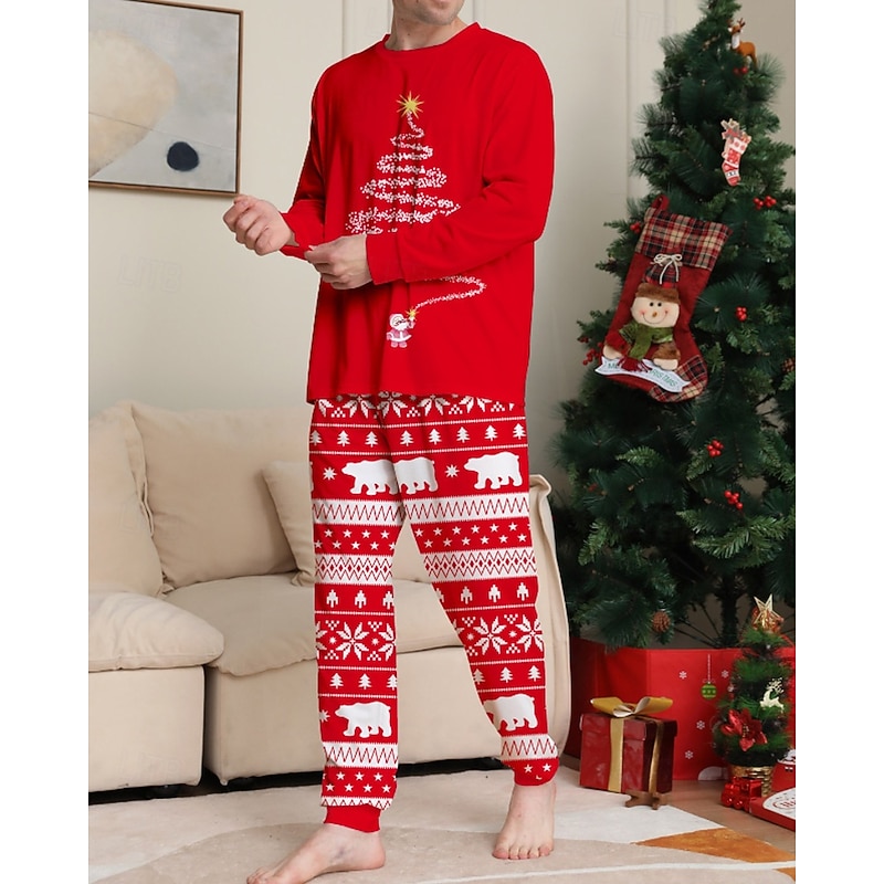Family Christmas Pajamas Christmas Pattern Home Print Red Blue Long Sleeve Active Matching Outfits 14