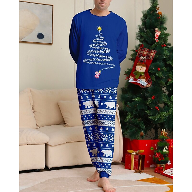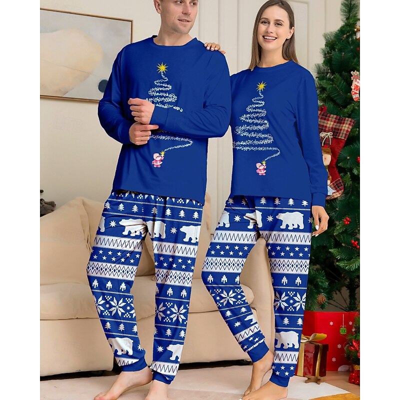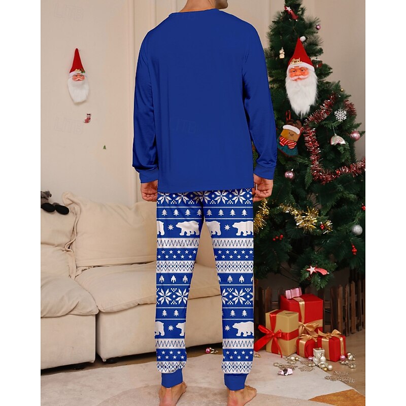 Family Christmas Pajamas Christmas Pattern Home Print Red Blue Long Sleeve Active Matching Outfits 18