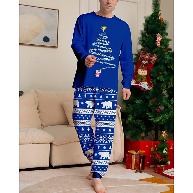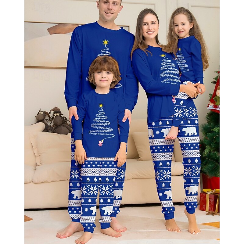 Family Christmas Pajamas Christmas Pattern Home Print Red Blue Long Sleeve Active Matching Outfits 1