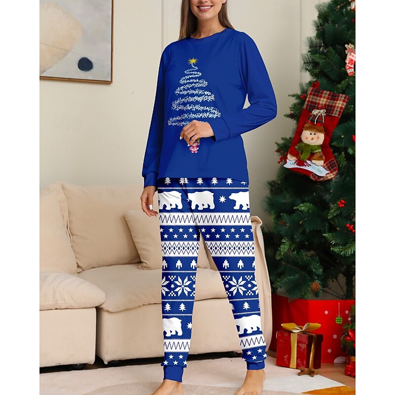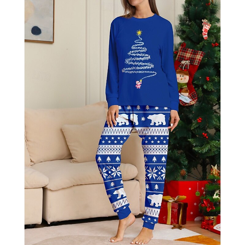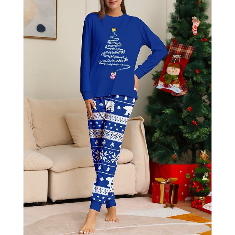 Family Christmas Pajamas Christmas Pattern Home Print Red Blue Long Sleeve Active Matching Outfits 20