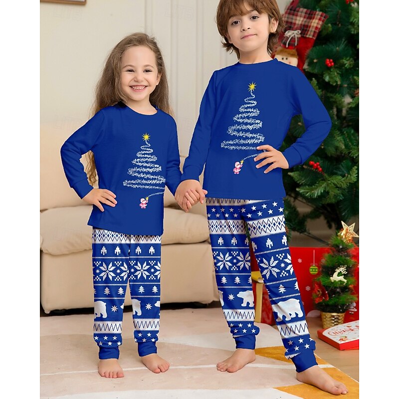Family Christmas Pajamas Christmas Pattern Home Print Red Blue Long Sleeve Active Matching Outfits 2