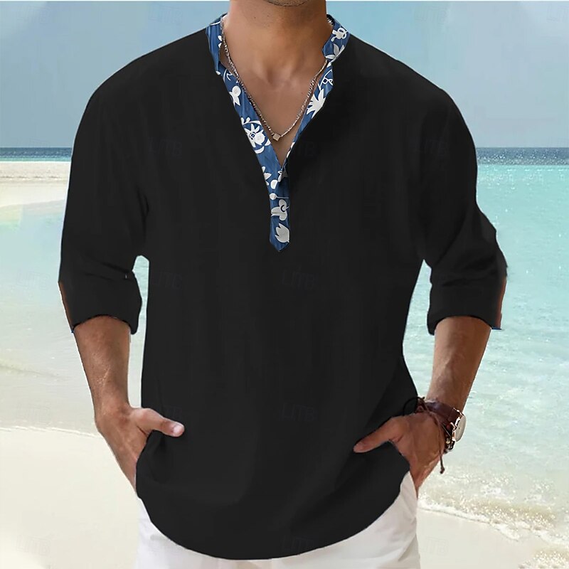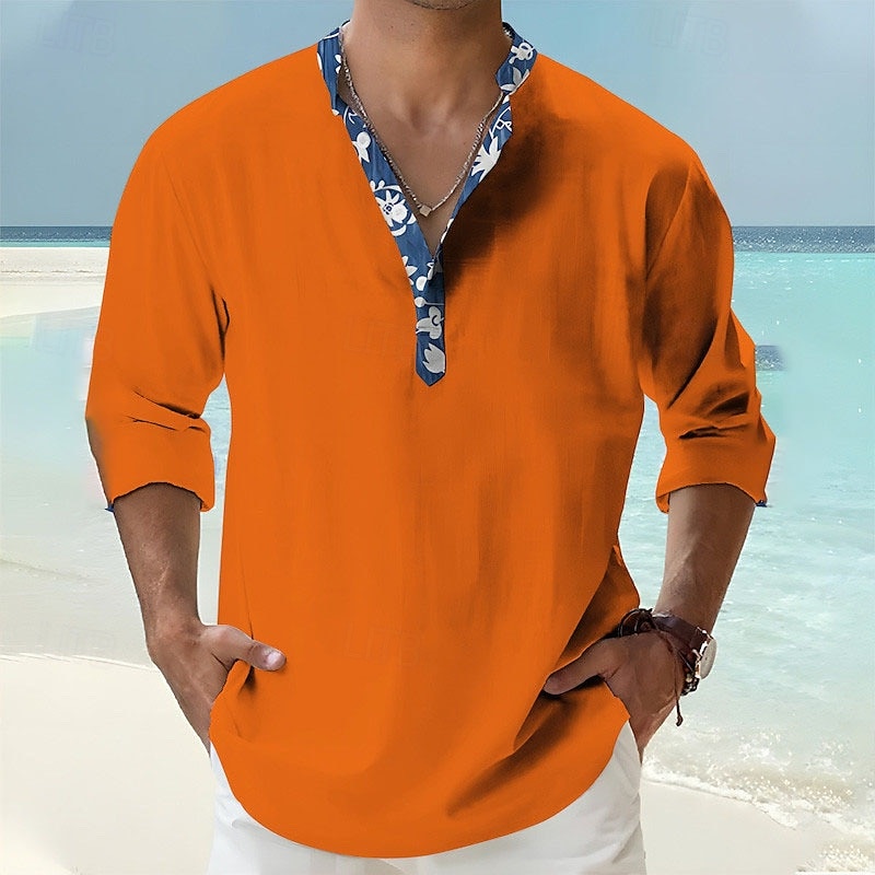 More information about Men's Shirt Popover Shirt Summer Shirt Casual Shirt Beach Shirt Black White Pink Orange Green Long Sleeve Floral Print Solid / Plain Color Band Collar Henley Vacation Hawaiian Buckle Clothing Apparel