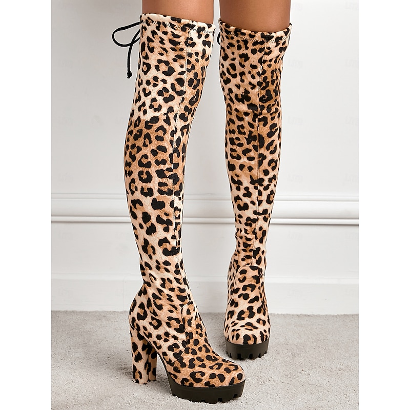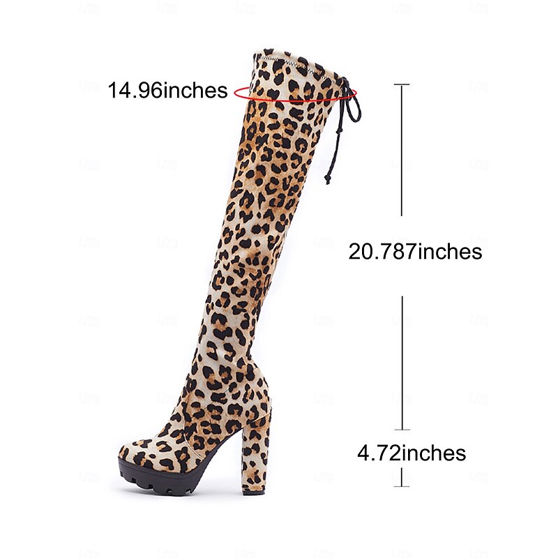 Highlights [Fabric] Crafted from a combination of faux leather and elastic fabric, these over-the-knee boots provide a sleek appearance akin to genuine leather while ensuring flexibility and comfort. The rubber outsole enhances durability and wear-resistance, making these boots suitable for various seasons, particularly fall and winter. [Fit] The boots are designed with a form-fitting silhouette that contours elegantly to the leg, offering both style and comfort. The added elastic fabric allows for a snug fit, while the platform sole provides extra stability. [Design Highlights] Featuring a towering chunky heel and platform for a bold, modern look, these boots also incorporate an adjustable drawstring closure at the top, ensuring a secure fit around the thigh. The round toe design adds a touch of minimalism, while the leopard pattern offers a trendy flair for those seeking a fashionable edge. [Occasions] Perfect for work, office environments, and various social gatherings, these boots can transition seamlessly from a classic business look to a chic, party-ready style. They pair well with both casual and dressy outfits, making them versatile for many occasions. [Size Range] Available in a variety of sizes to accommodate different foot measurements, the boots come in US sizes from 5.5 to 10, equivalent to EU sizes 35 to 42. This range ensures a comfortable fit for a broad spectrum of wearers.