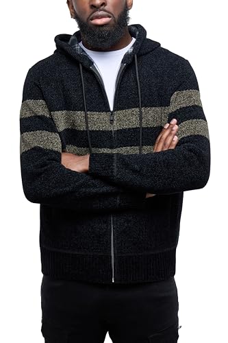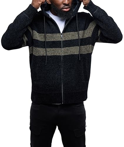 CULTURA AZURE Mens Zip Up Plaid Lined Knit Cardigan Hooded Sweater, Full Zip Classic Fit Sweater with Stripes & Lining 1