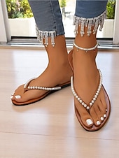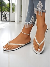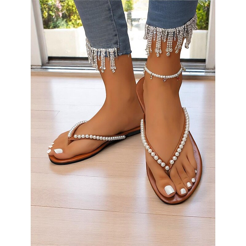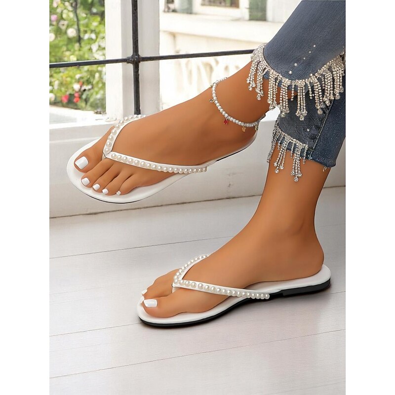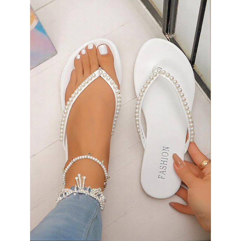HOT ! Women's Pearl Embellished Flip Flop Sandals - Casual Chic Thong Flats for Daily Outings and Summer Dates
