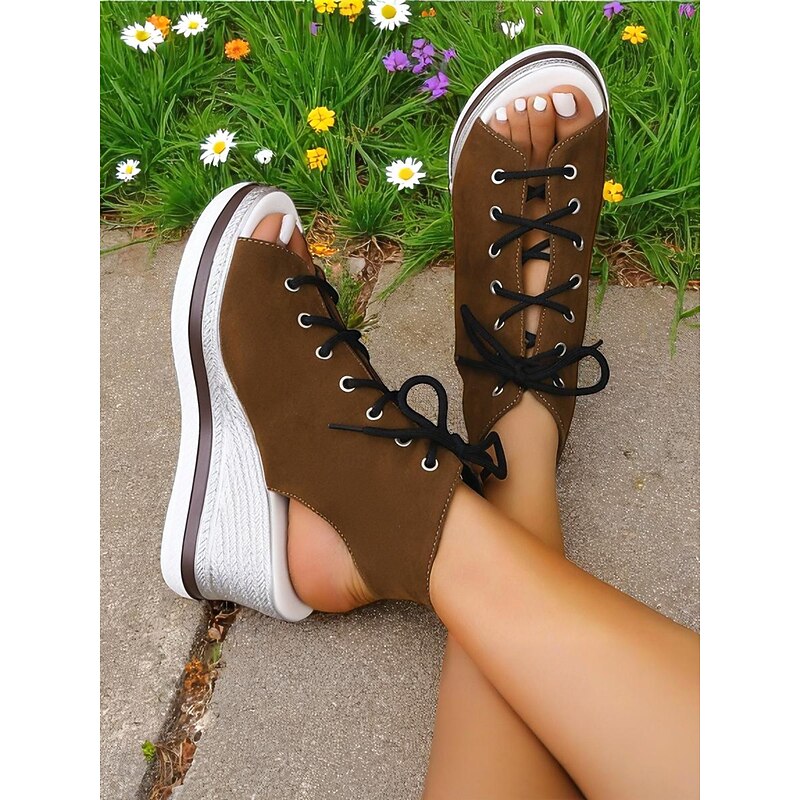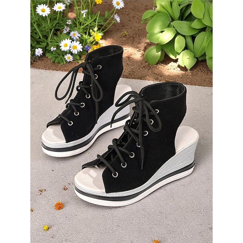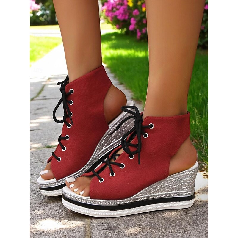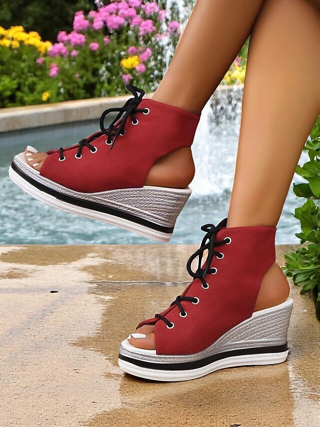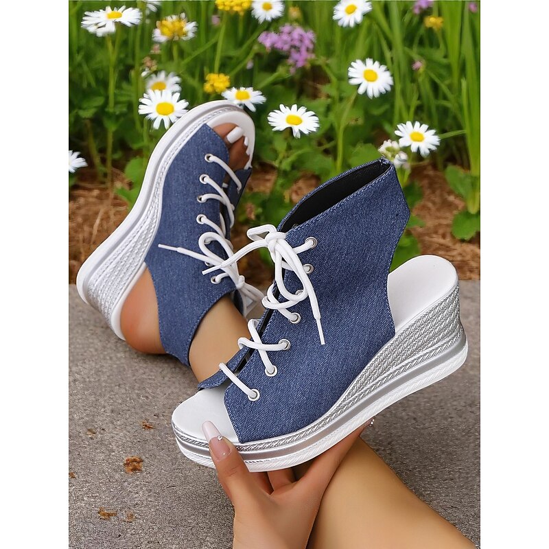 Women's Lace-Up Denim Wedge Sandals, Fashion Peep-Toe Summer Shoes, Perfect for Poolside, Brunch Outings and Seaside Cafés 21