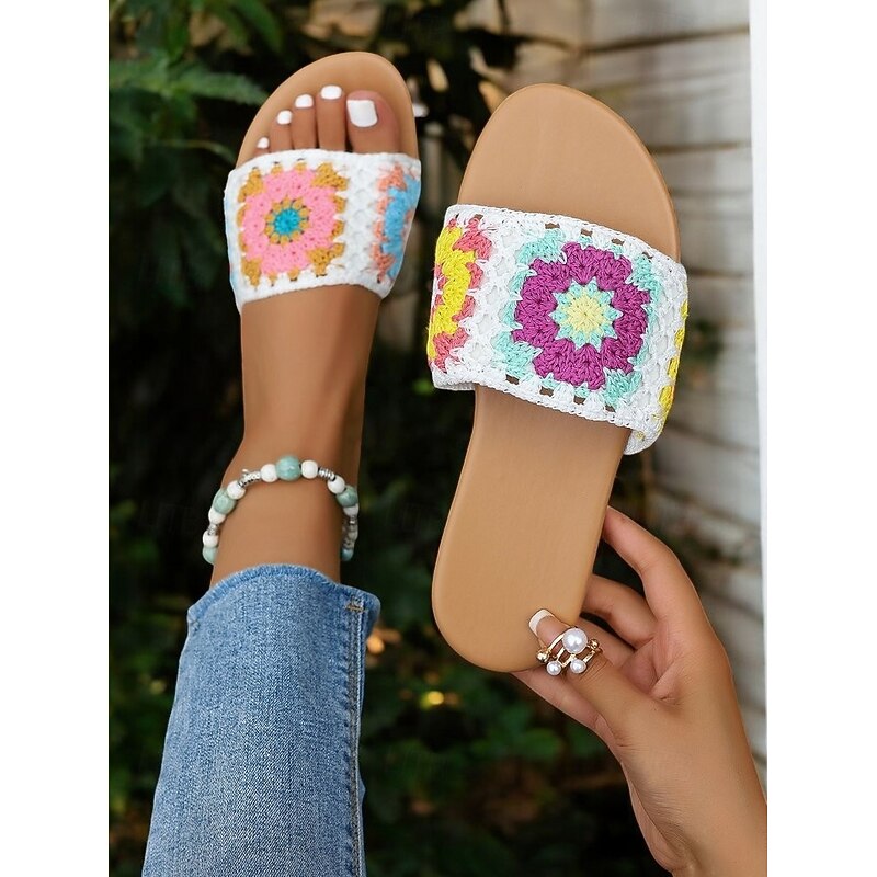 HOT ! Women's Handwoven Crochet Slide Sandals with Colorful Floral Patterns, Boho Summer Flats for Beach, Vacation, and Casual Wear