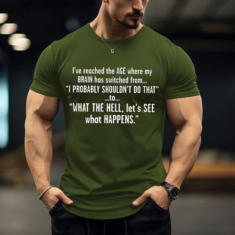 HOT ! Men's Humorous Graphic T-Shirt: "What The Hell, Let's See What Happens" - Age Brain Shift Lifestyle Tee