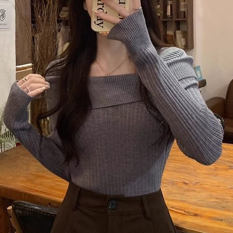 Women's Sweater Pullover Streetwear Casual Solid Color Off Shoulder Knitted Long Sleeve Regular Tops Knit Outdoor Holiday Going out Black White Fall Winter 15
