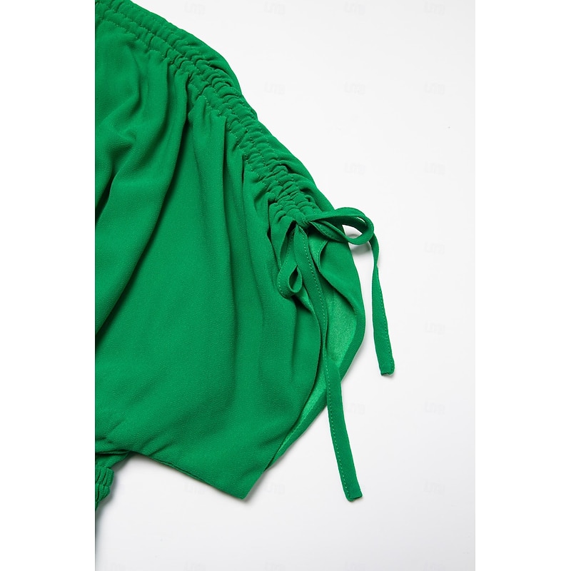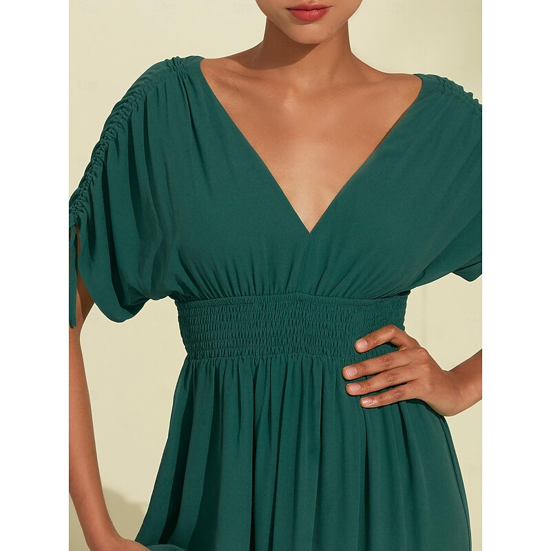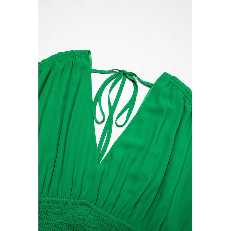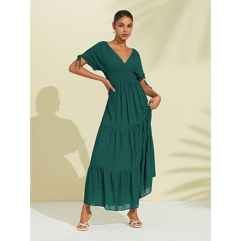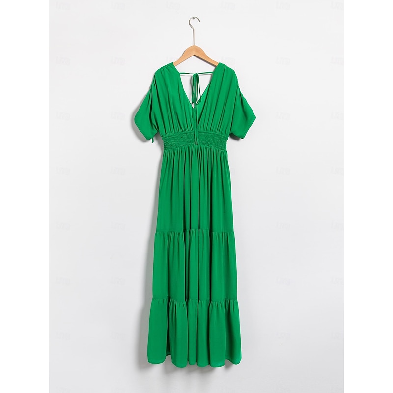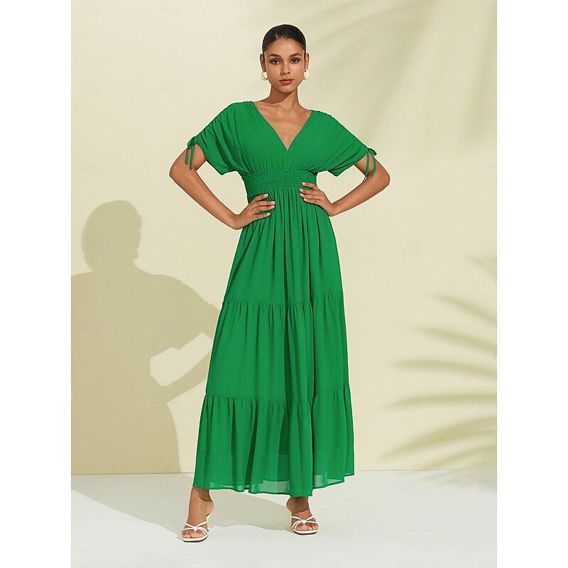 Highlights - Perfect for summer vacation - Made with lightweight and breathable chiffon fabric - Short sleeves for a comfortable fit - Maxi length for an elegant look - Specifically designed for women - Beautiful green dress with a tie back detail - Flattering V neckline for a sophisticated touch