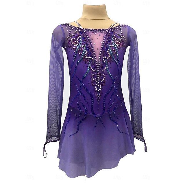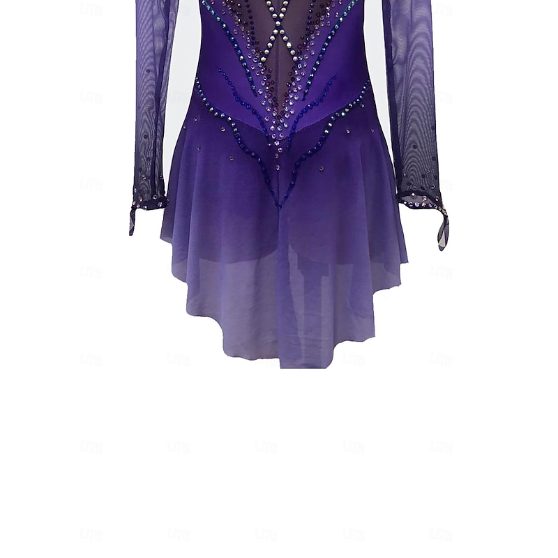 More information about Figure Skating Dress Women's Girls' Ice Skating Dress Violet Patchwork Thumbhole Mesh Spandex Stretchy Training Practice Professional Skating Wear Crystal / Rhinestone Long Sleeve Ice Skating Figure