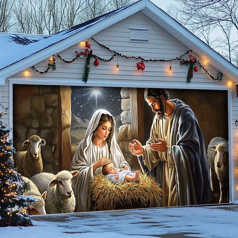 Christmas Outdoor Garage Door Cover Xmas Banner Nativity Scene Large Christmas Backdrop Decoration for Holiday Outdoor Garage Door Home Wall Decorations