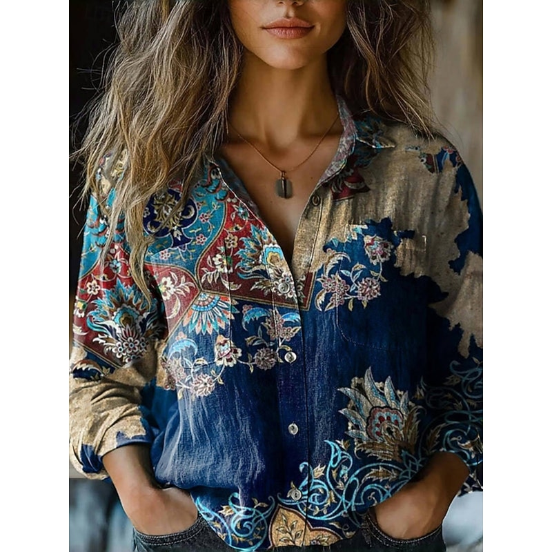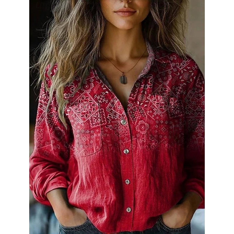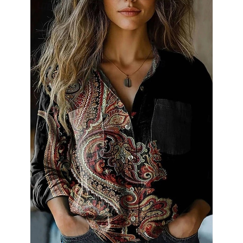 HOT ! Women's Shirt Floral Paisley Stylish Modern Long Sleeve Shirt Collar Regular Tops Daily Holiday Buttons Pocket Print Maroon Black Yellow Wine Red Summer