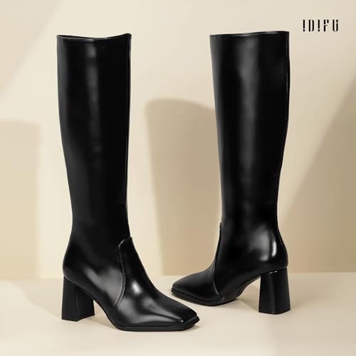 IDIFU IN3 Knee High Boots for Women Square Toe GoGo Chunky High Heeled Tall Long Fall Boot with Side Zipper Dress Comfortable Fashion Pull On Small Thick Heel Boots 1