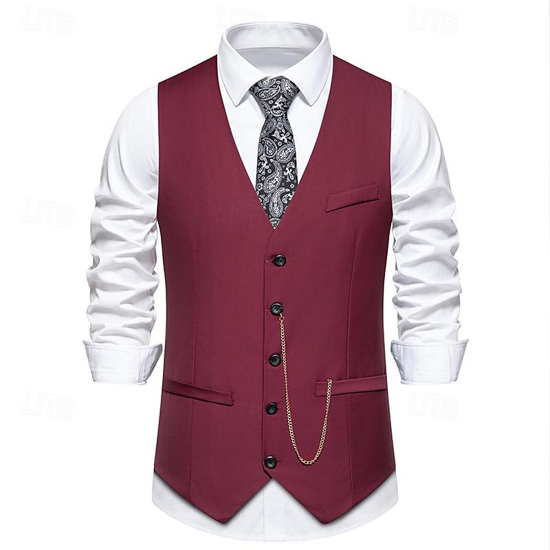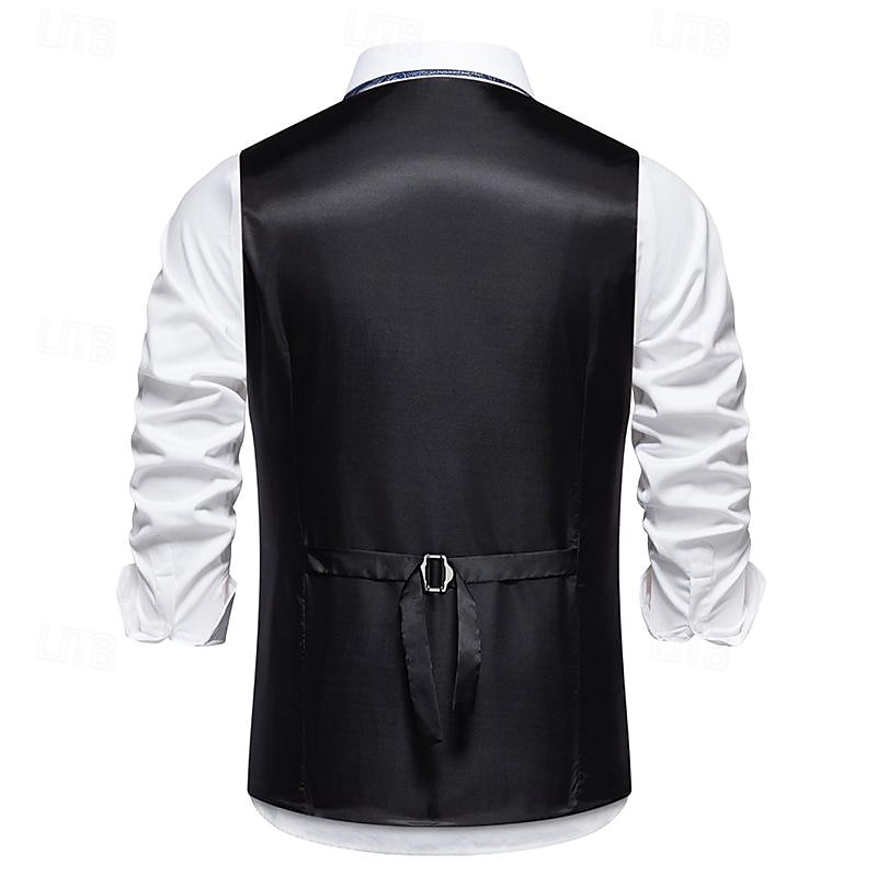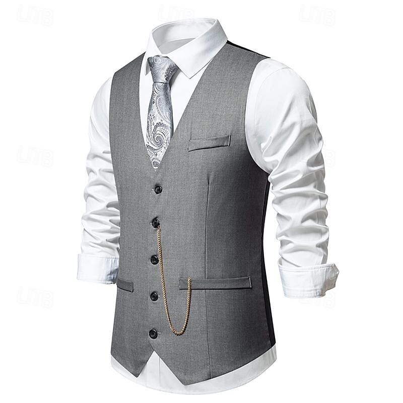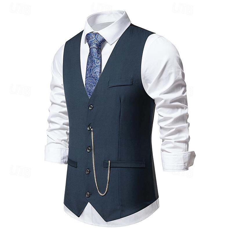 : The vest is designed with a distinctive V-neckline and includes traditional button closures for a timeless look. It also features a single chest pocket and two lower welt pockets, with an optional decorative chain accessory that adds a fashionable flair.
