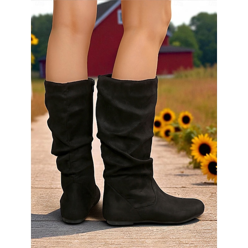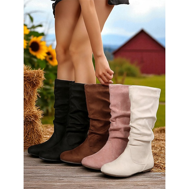 HOT ! Women's Pink Mid Calf Flat Boots with Side Zipper Casual Slouch Boots for Autumn Days, Country Homes and Outdoor Errands