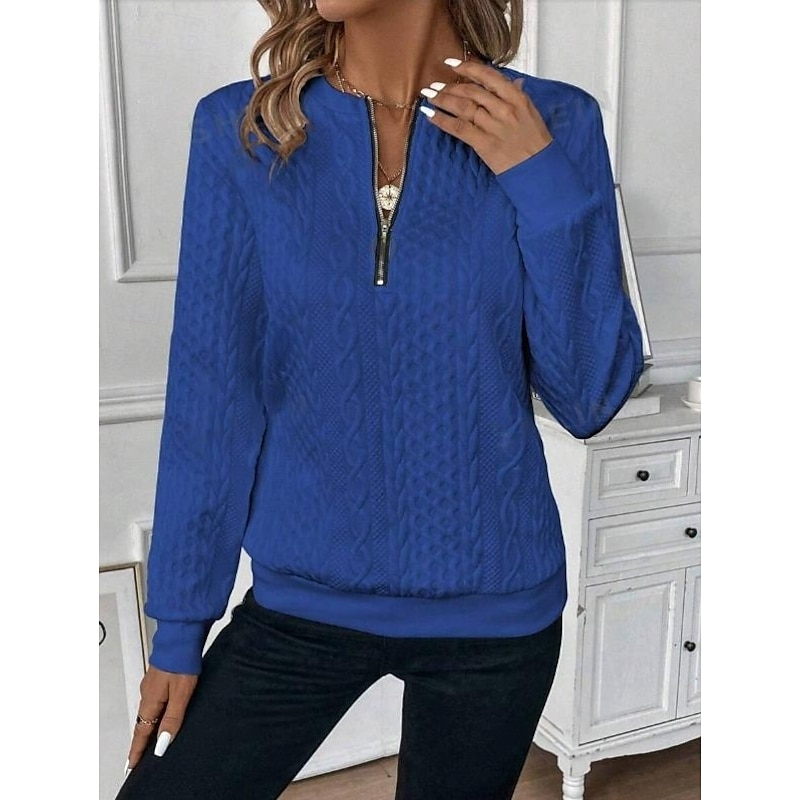 Highlights [Fabric] : Crafted from high-quality polyester, this women's sweatshirt offers a micro-elastic texture, ensuring both comfort and durability. The soft and cozy material makes it an ideal choice for transitional seasons like spring and fall. [Fit] : The loose fit design provides a relaxed yet modern silhouette, perfect for those who appreciate a blend of style and comfort. Its versatility makes it suitable for various body types. [Design Highlights] : This elegant sweatshirt features a plain yet sophisticated look with a functional front zipper that adds both practicality and a fashion-forward edge. The crew neck and ribbed cuffs complete the classic design, offering a snug silhouette that retains its shape over time. [Occasions] : Ideal for work environments and casual settings, this sweatshirt effortlessly blends elegance with a modern flair. It's perfect for office wear or weekend outings, easily pairing with jeans or skirts to suit a range of occasions. [Size Range] : Available in a variety of sizes, including S, M, L, XL, and 2XL, ensuring a fit for a wide range of preferences and body types.