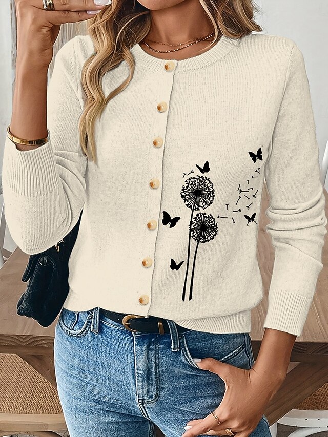 HOT ! Women's Cardigan Elegant Vintage Daily Floral Graphic Ribbed Crew Neck Buttons Knitted Long Sleeve Regular Tops Knit Outdoor Home Work Black Red Fall Winter