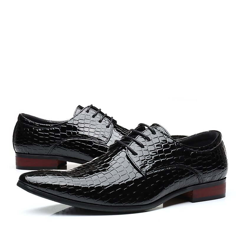 Highlights [Fabric] Expertly crafted from high-quality PU leather, these men's Oxford shoes feature an embossed crocodile pattern that adds an exotic touch to the sophisticated design. The glossy patent finish provides a luxurious look that's perfect for formal settings. [Fit] These shoes are designed with a classic lace-up closure that ensures a snug and secure fit. The round toe shape provides comfort while maintaining an elegant silhouette. [Design Highlights] The shoes boast an intricate splicing embellishment, enhancing their visual appeal. With a sturdy, low-block heel, they offer both style and practical comfort for extended wear. [Occasions] Ideal for formal events, business meetings, or a stylish evening out, these Oxford shoes elevate any ensemble with their striking design and classic British gentleman style. [Size Range] Available in sizes US6-11.5, they are constructed to standard sizing, allowing you to choose your regular size for a perfect fit.