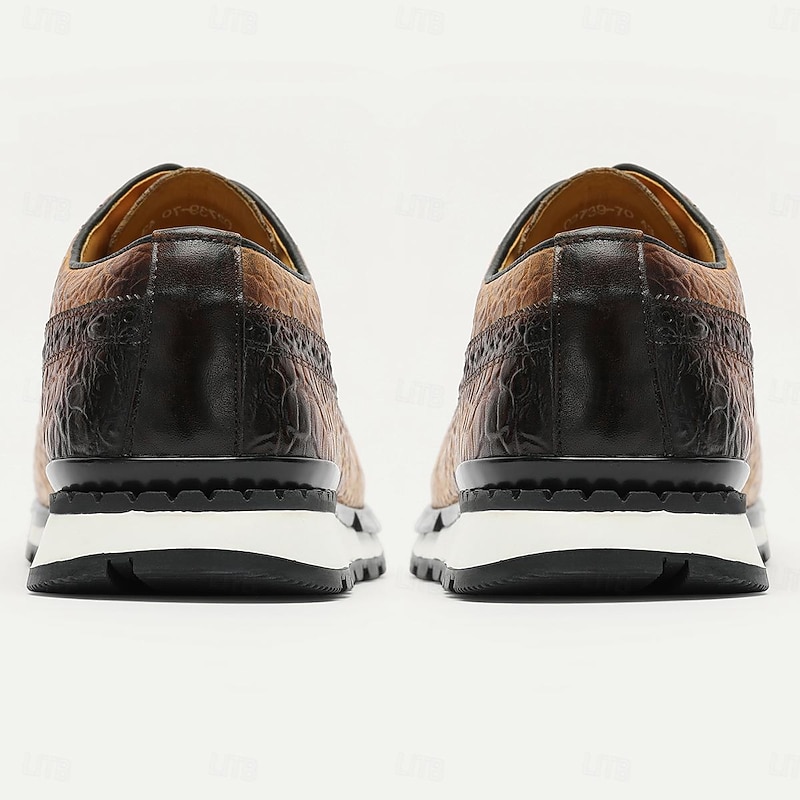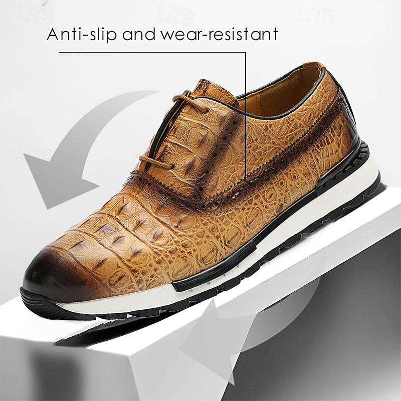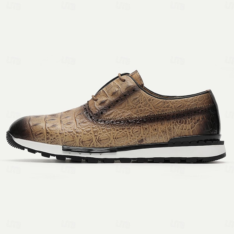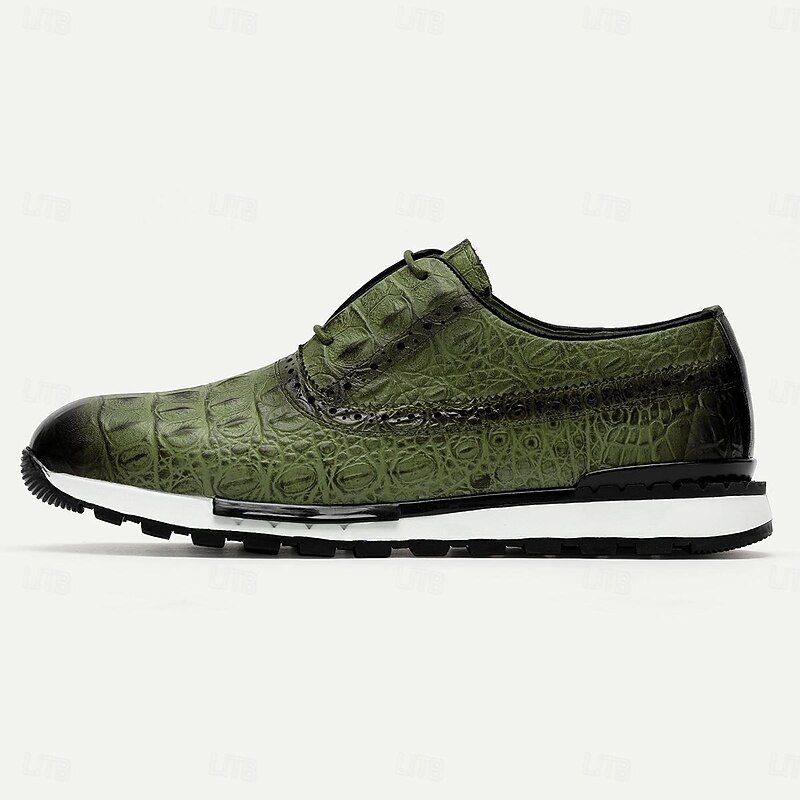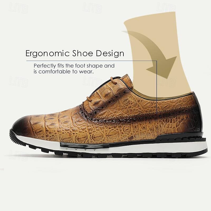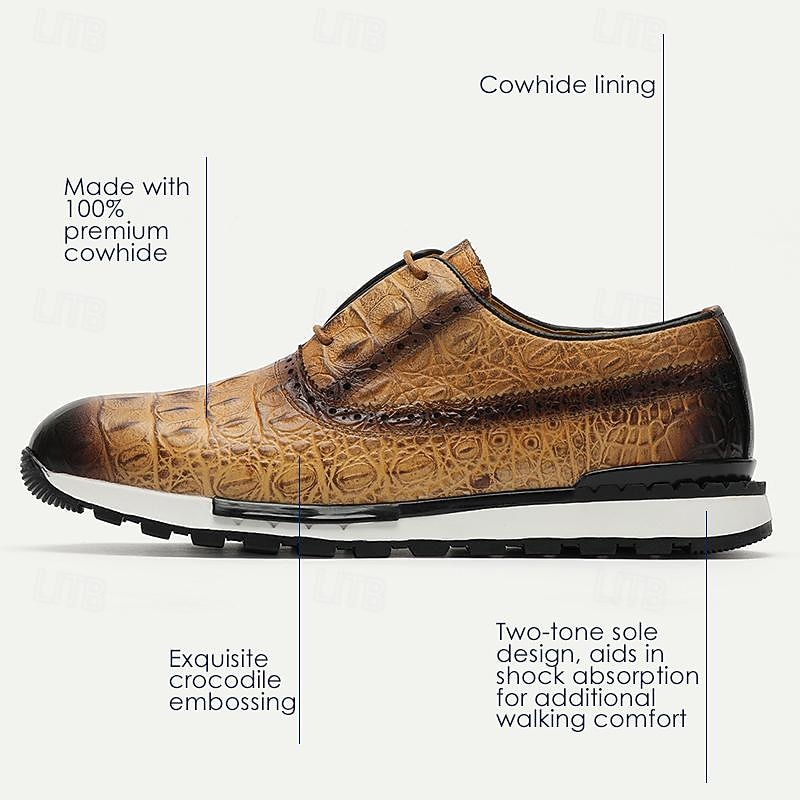 Highlights [Fabric] : Expertly crafted from luxurious Italian full-grain cowhide, the upper of these men's dress sneakers offers a premium look and feel, ensuring both durability and sophisticated style. The cowhide lining adds an extra layer of comfort, enhancing the overall luxurious experience. [Fit] : Designed with a classic round toe and lace-up closure, these sneakers provide a comfortable and secure fit. The combination of leather and a cushioned EVA midsole ensures optimal support and flexibility, making them suitable for extended wear. [Design Highlights] : These sneakers feature an embossed texture inspired by alligator skin, presenting a refined and elegant aesthetic. The gradient brown color transitions smoothly from a lighter to a darker shade, complemented by an eye-catching almond, brown, or green color palette. The black ridged rubber outsole offers superior slip resistance, while the lace-up design retains an element of timeless style. [Occasions] : Ideal for both formal and casual settings, these dress sneakers seamlessly enhance any outfit. Whether you're attending a business meeting or enjoying a casual day out, these shoes add a touch of elegance and sophistication to your ensemble. [Size Range] : Available in a variety of sizes from US6 to US13, these sneakers accommodate a wide range of preferences, ensuring the perfect fit for different foot shapes and sizes.