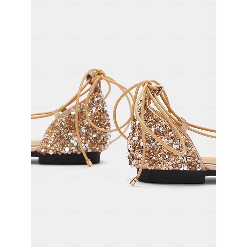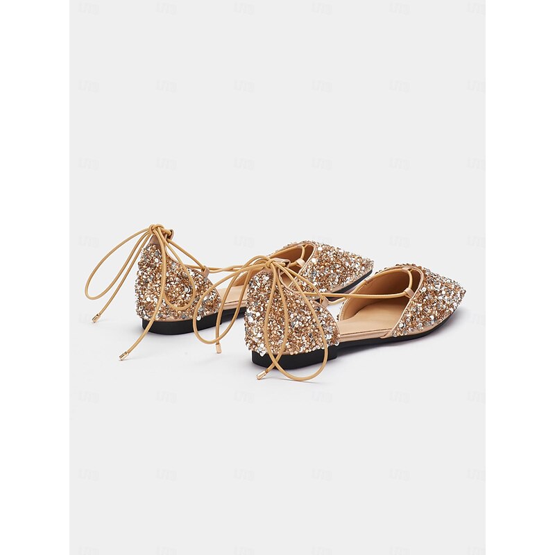 Highlights [Fabric and Design] : Crafted with sparkling glitter adorned with delicate rhinestones, these women's flats are a perfect blend of fashion and glamour. The upper material creates a dazzling effect, while the soft synthetic leather lining ensures added comfort. This design showcases a pointed toe, enhancing the sleek and modern silhouette of the shoes. [Cut and Style] : These lace-up flats feature a sophisticated pointed toe design, providing an elegant appeal. The flat heel offers both comfort and style, making them suitable for long hours of wear. The neutral gold color enhances versatility, allowing these flats to complement a variety of outfits. [Unique Features] : The standout design includes stylish ankle ties that offer an adjustable fit, ensuring personalized comfort throughout wear. The sturdy rubber outsole adds durability and support, making these flats a reliable choice for various events. [Occasions] : Ideal for parties and special occasions, these glittery flats add a touch of luxury to any ensemble. Whether at a formal event, a night out, or a casual gathering, these shoes effortlessly elevate your look with their sparkling details and fashionable appeal. [Size Range and Suggestions] : Available in sizes ranging from US5.5 to US10.5, these flats cater to a variety of foot sizes. They are designed in standard sizing; however, for individuals with wide feet, it is recommended to choose one size up to ensure a comfortable fit.