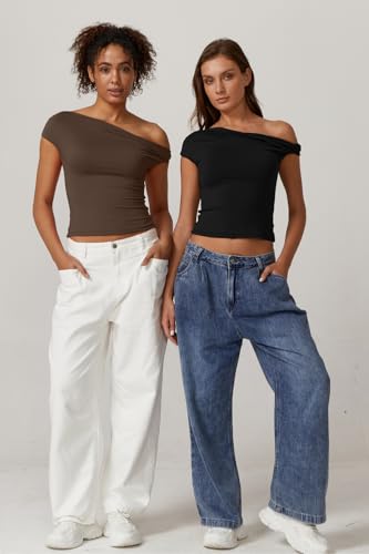 QINSEN Womens Twisted Off The Shoulder Tops Double Lined Short Sleeve T Shirts Slim Fitted Stretchy Tee 1