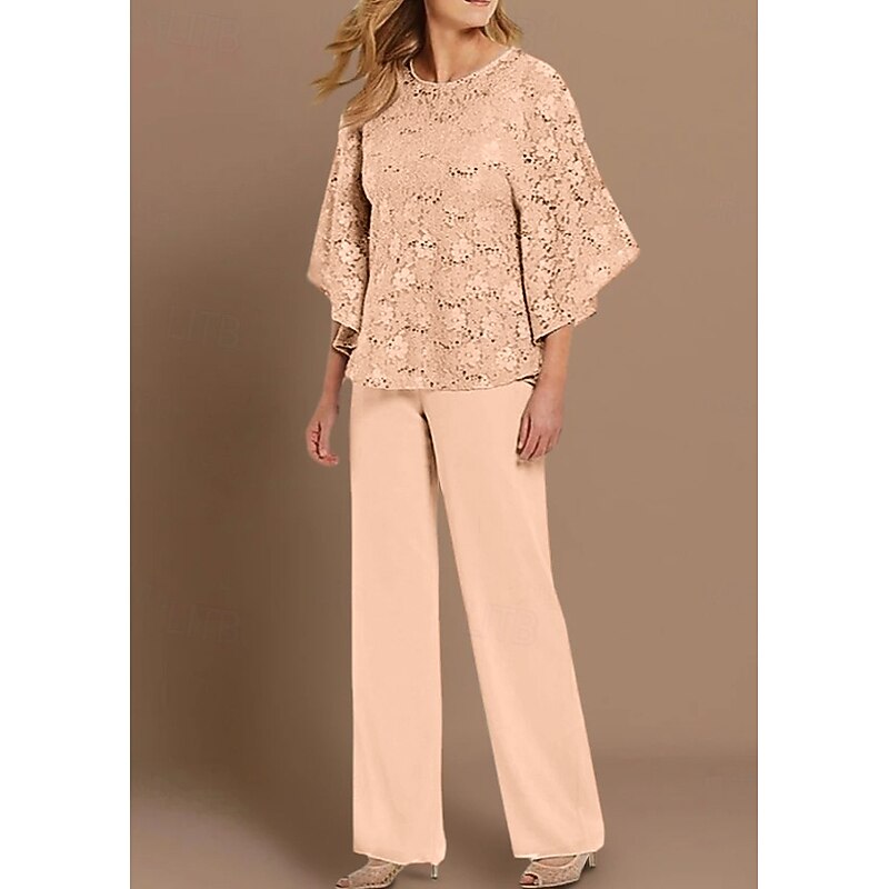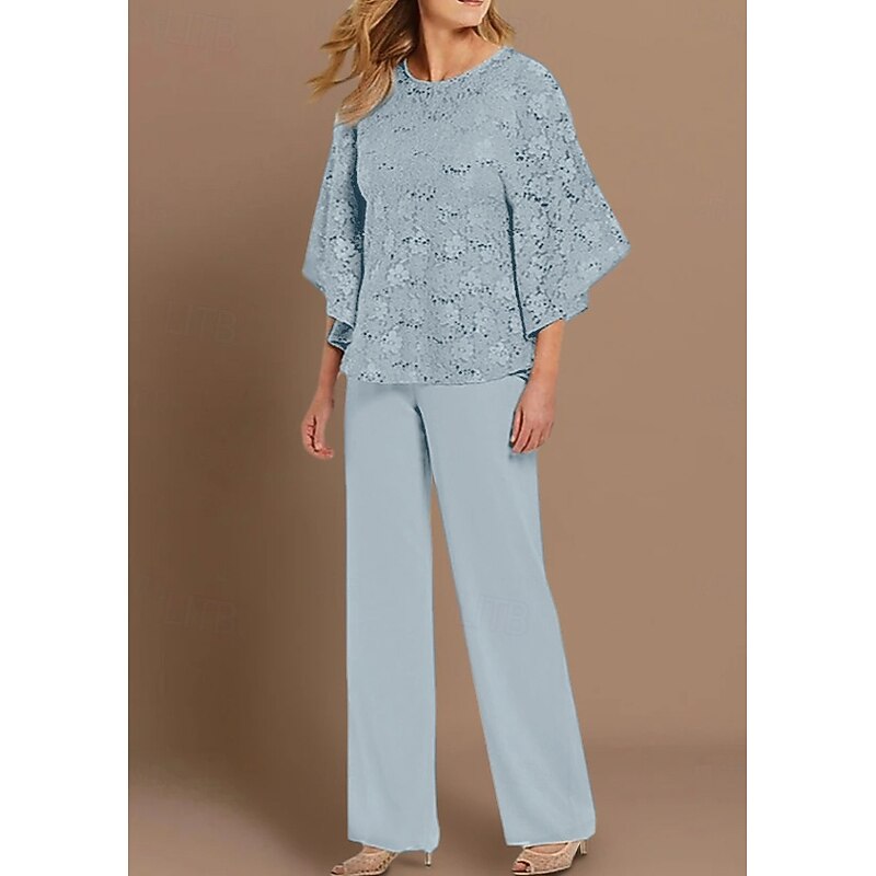 More information about Two Piece Pantsuit Mother of the Bride Formal Wedding Guest Church Elegant Jewel Neck Floor Length Chiffon Lace 3/4 Length Sleeve with Embroidery