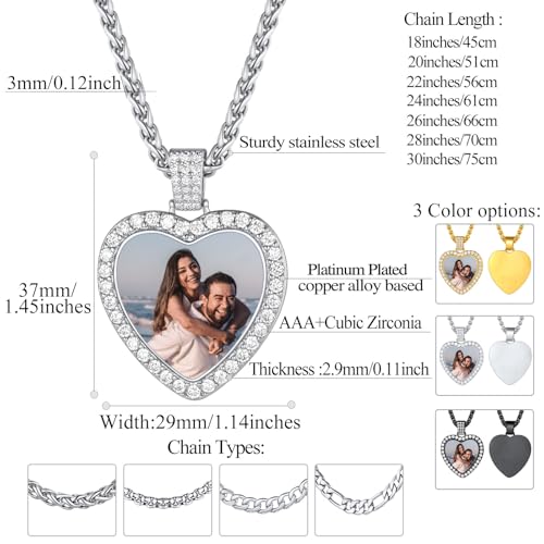 • Customizable heart photo necklace with CZ inlaid: Click "Customize Now" "upload one prepared legible picture in the front side and continue to click back side "choose the font, then input the words " You will get an unparalleled bling iced-out necklace. With the picture of your loved ones or important event on the pendant, keep some loving memory always near your heart.