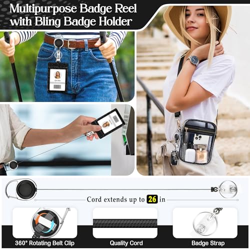 • 【Multifunctional Badge Reel with Bling ID Badge Holder】: Unlike other offers for stadium bags, our offer also includes a badge reel with a matching bling ID card Holder. This retractable reel comes with a key ring and can hold up to 3.5 ounces. This key reel is easily attached to belt loops, bags, straps, etc… The bling ID holder has a transparent window and can hold up to 2 cards.