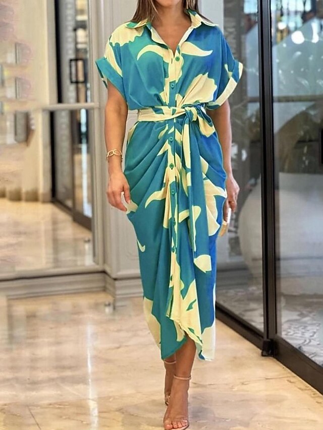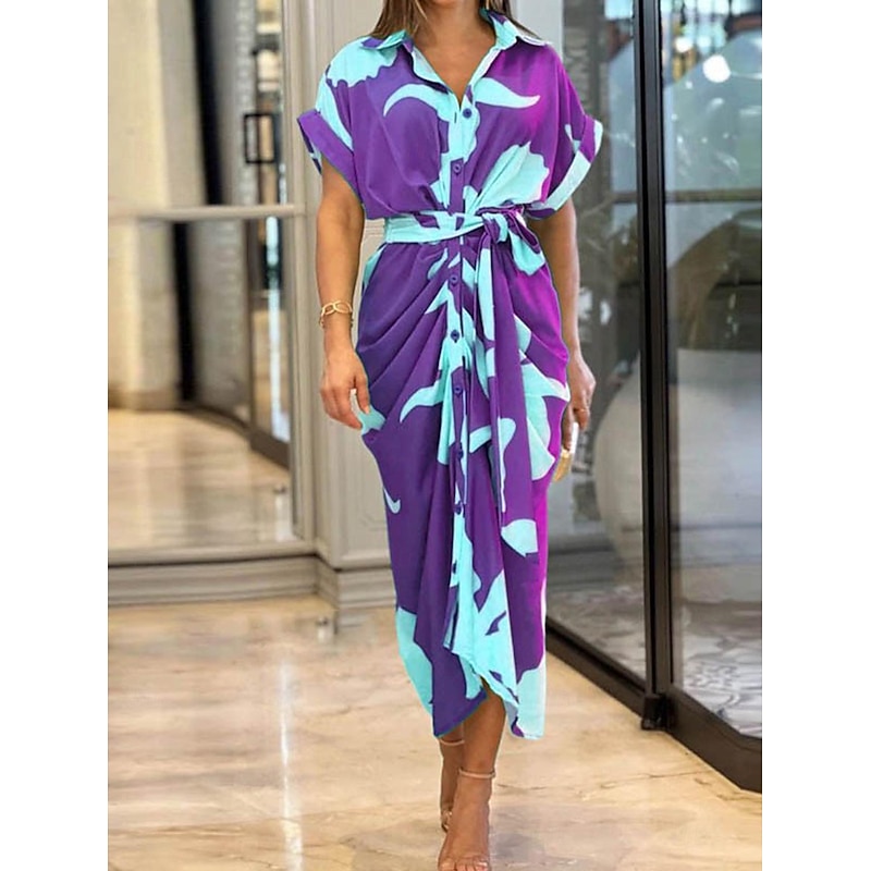 : The dress showcases a stylish shirt collar and a button-down front, lending it a sophisticated look. The vibrant leaf and floral prints in a variety of colors, including green, red, pink, purple, yellow, and blue, add a lively touch. The design is completed with short sleeves and a matching tie belt, allowing for a customizable fit and added elegance.
