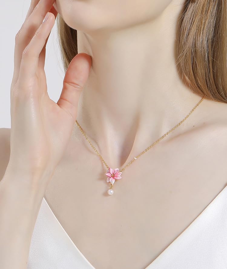Magnolia Pink Flower And Pearl Enamel Pendant Necklace Handmade Jewelry Gift Juicy Grape 4