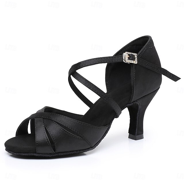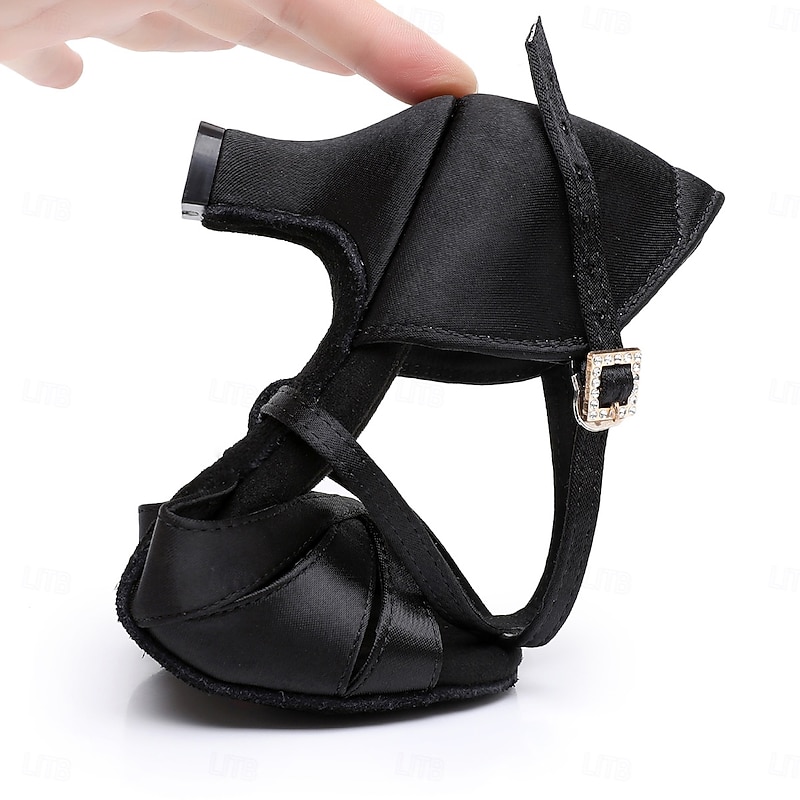 HOT ! Women's Black Satin Cross-Strap Ballroom Dance Shoes with Rhinestone Buckle, Comfortable Heels for Latin and Salsa Dancing