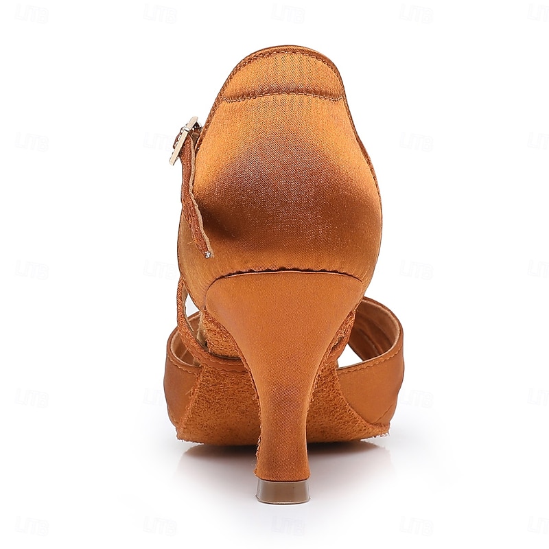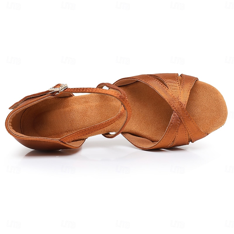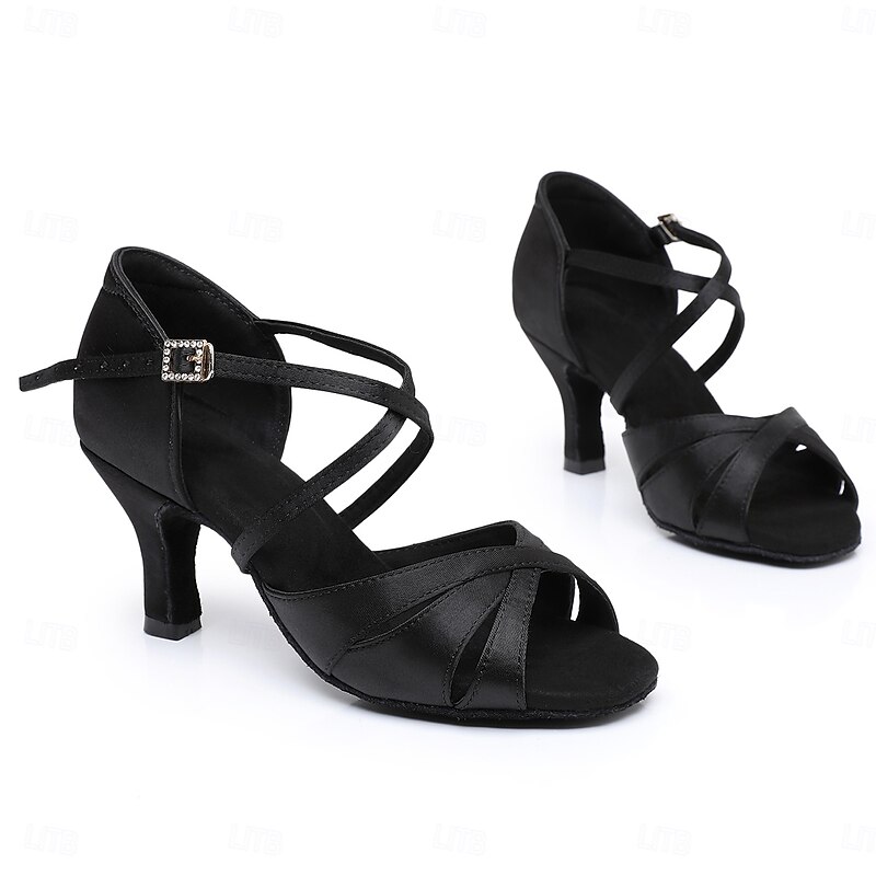 Highlights [Fabric] : Crafted from high-quality satin, the Women's Black Satin Cross-Strap Ballroom Dance Shoes provide a sleek and glossy appearance. The satin material ensures durability and a luxurious feel, making these shoes perfect for both formal and dance occasions. [Fit and Shape] : Featuring a medium-height, flared heel, these shoes offer the perfect balance between style and comfort, enhancing your posture while allowing easy maneuverability on the dance floor. The open-toe design allows for breathability and flexibility, ensuring a comfortable fit through extended periods of wear. [Design Highlights] : Intricate crisscross straps enhance the aesthetic appeal of these shoes while providing a secure fit, ensuring stability and confidence during dance movements. An adjustable ankle strap with a subtle gold buckle adds a touch of elegance and allows for customization to accommodate various foot shapes and sizes. [Occasions] : Ideal for Latin and salsa dancing, these versatile shoes are also perfect for ballroom events, evening parties, and formal occasions. Experience the blend of elegance and functionality, making them a standout choice for any event requiring comfort and style. [Size Recommendation] : Available in a range of sizes from US5 / EU35 / UK3 to US9.5-10 / EU41 / UK7.5-8, these shoes are designed for adults, offering a standard fit and easy selection of your usual size for a perfect fit.