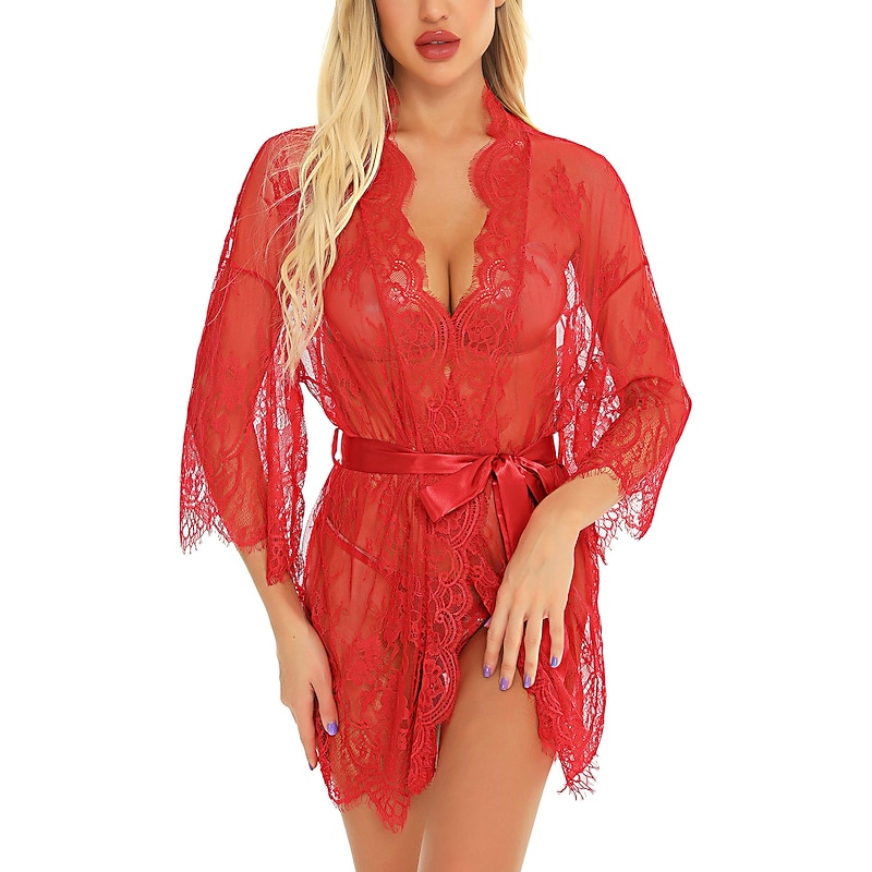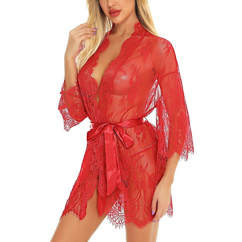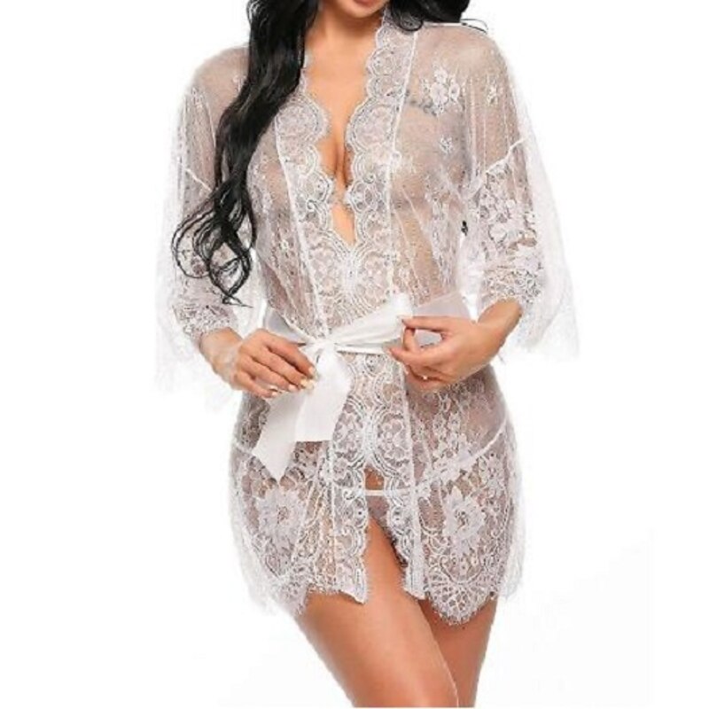 The robe boasts long, flowing sleeves adorned with scalloped edges, enhancing femininity and grace. The delicate lacework offers a touch of sophistication, while the transparent fabric adds to its sensual appeal.