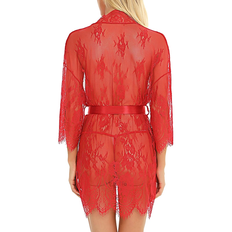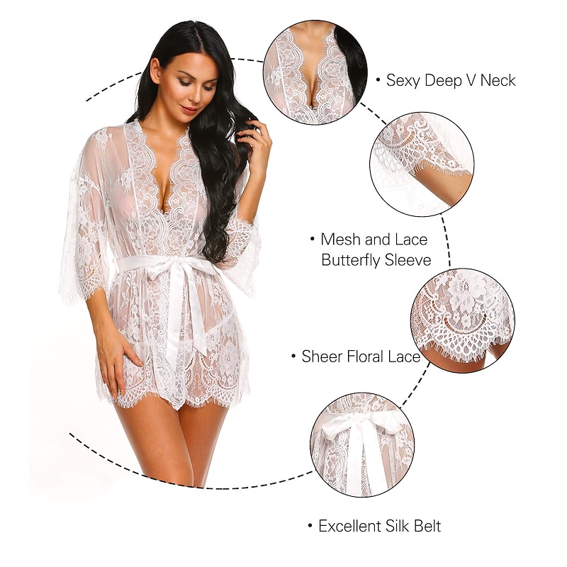This seductive robe is crafted from high-quality spandex, ensuring a comfortable fit that gently hugs the body. The sheer, see-through fabric highlights the intricate floral lace pattern, creating a sophisticated and alluring silhouette.