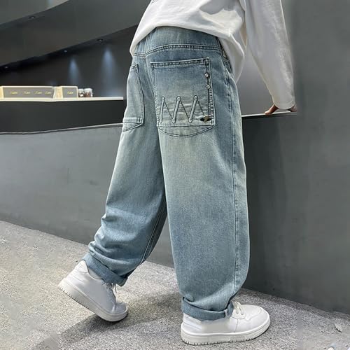 HOT ! Boy's Baggy Jeans Y2K Wide Leg Straight Denim Pants Kids Casual Elastic Waist Loose Trousers Pockets Streetwear 4-14T