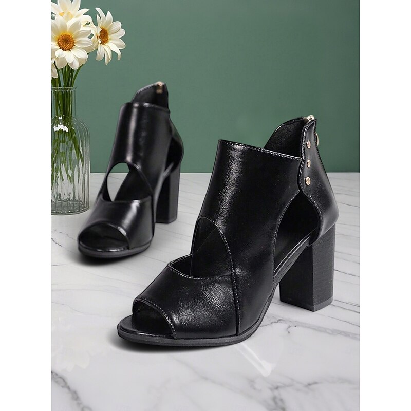 HOT ! Contemporary Chunky Heel Sandals - Chic Faux Leather Peep-Toe Booties with Cutout Details, Perfect for Office and Daily Outings