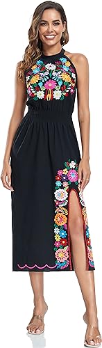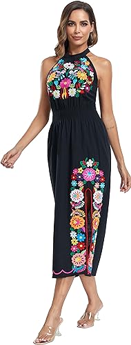 • BEAUTIFUL DESIGN: This boho halter dress boasts a traditonal mexican floral embroidery design combined with a modern style dress. The neck hanging and slit are very suitable for summer beach parties. It is comfortable and light for leisure and vacation.