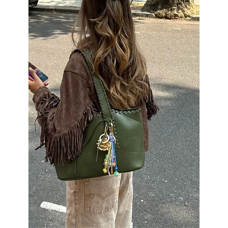 : The jacket is designed with unique fringe detailing along the sleeves, adding a bohemian flair to its stylish appearance. It has a single-breasted button-up front and a classic turndown neckline, along with practical pockets for added convenience and style.