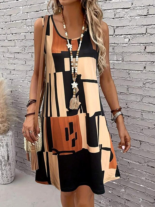 HOT ! Women's Mini Dress Sundress A Line Dress Summer Dress Vacation Casual Regular Fit Graphic Geometric Color Block Sleeveless U Neck Light Brown Blue Summer Spring