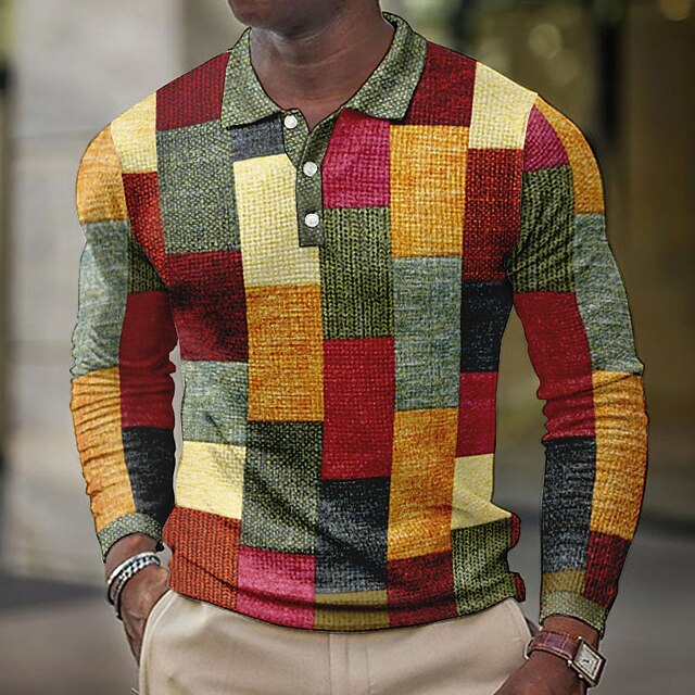 Highlights [Fabric Composition] : Expertly crafted from a comfortable and textured knit fabric, this men's polo shirt combines warmth with contemporary style, making it an ideal choice for transitional weather. The waffle weave adds depth and character, ensuring a cozy yet stylish wear. [Fit and Silhouette] : Designed with a flattering fitted silhouette, this long-sleeve waffle polo shirt enhances your shape while providing a modern, polished look. The classic collar and button-up placket contribute to its sophisticated appearance, offering a timeless appeal. [Design Highlights] : This shirt features a bold plaid pattern with a vibrant patchwork of colors including red, yellow, green, and black, creating a visually striking mosaic effect. The intricate 3D print along with stylish buttons add a unique flair, while the collared neckline lends a touch of elegance. [Occasions] : Versatile in style, this shirt is perfect for various occasions such as vacation wear, formal events, festival outings, or casual daily adventures. Whether golfing or enjoying a day out, it makes a statement and stands out with its bold design and rich colors. [Size Range] : Available in a broad range of sizes from S to 5XL, ensuring a perfect fit for everyone. This accommodating size range guarantees comfort and style for all body types, allowing every man to enjoy this vintage, casual piece.