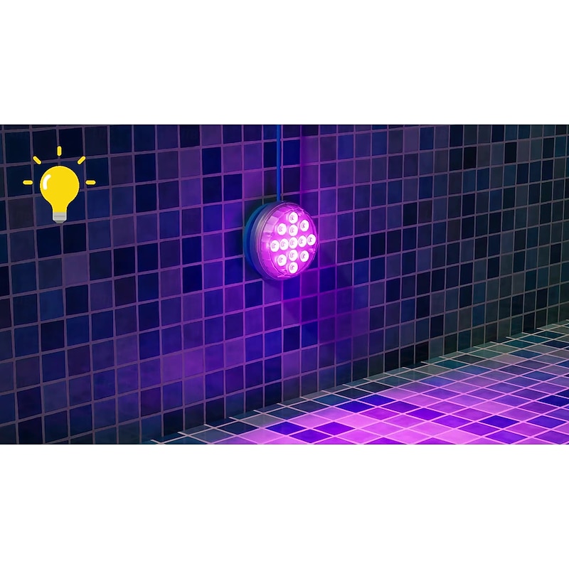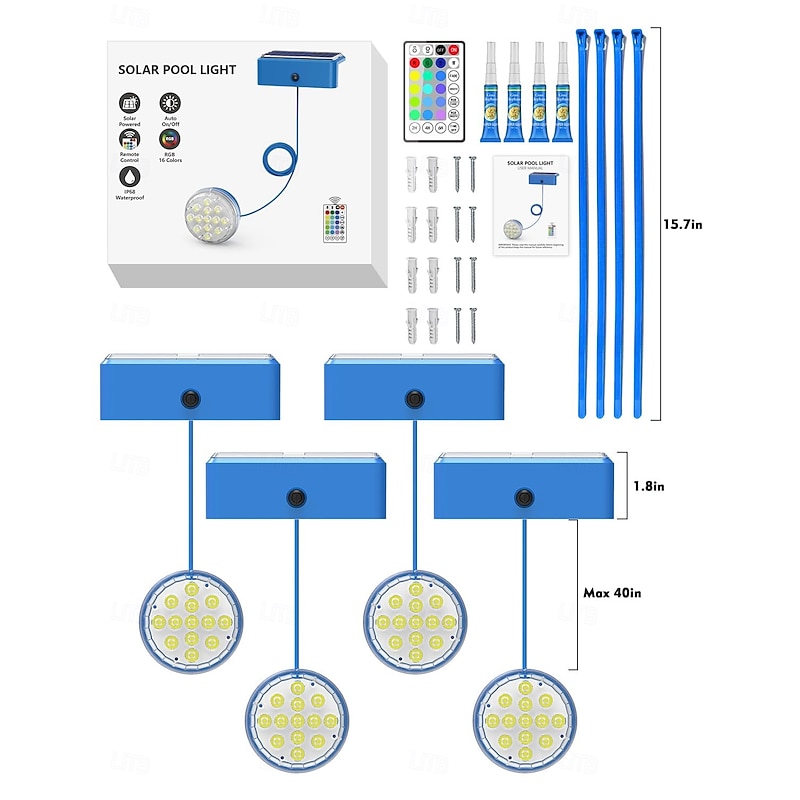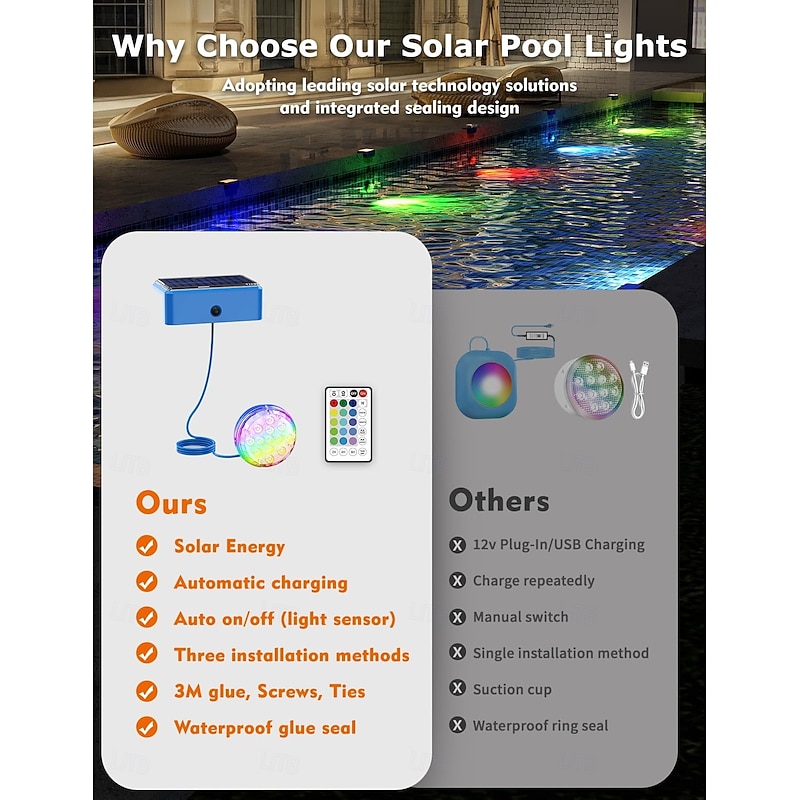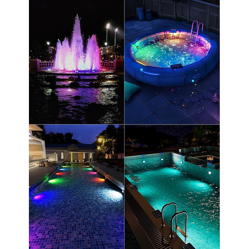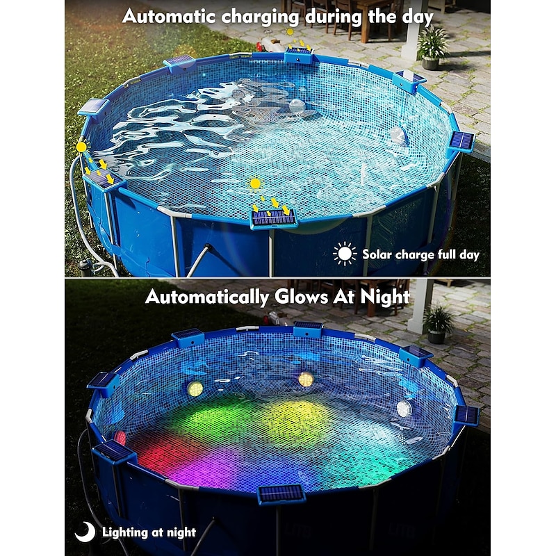 Highlights 【20 Lighting Modes】Each solar pool light features 13 vibrant RGB LED beads, offering 16 solid colors + 4 dynamic modes (monochrome gradient/pulse, RGB gradient/pulse) for 20 customizable scenes. Switch effortlessly between a serene starlit-blue oasis or pulsating neon party vibes, transforming your pool into a mesmerizing visual art installation and crafting unforgettable moments of romance. 【Timer & Remote Control】Equipped with 2H/4H/6H auto on/off timers and a 33ft (10m) long-range remote, adjust 8 brightness levels and 20 lighting modes from indoors. With multi-light synchronization, unify all lights’ rhythms instantly—from energy-saving convenience to precise control over party lighting intensity, to igniting a synchronized aquatic light show. Command lightscapes at your fingertips, no poolside adjustments needed. 【1500mAh Solar Powered Lights】Powered by a high-density lithium battery and solar panel, 6 hours of sunlight delivers 6-8 hours of radiant runtime, eliminating the hassle of frequent battery changes. Illuminate your pool like daylight after dark, creating an immersive round-the-clock party experience. 【IP68 Waterproof Design】Both the light body and solar panel are IP68-certified, enduring submersion up to 3 meters and resisting extreme weather like torrential rains or scorching sun. Say goodbye to corrosion or short circuits—install worry-free in indoor hot tubs, outdoor ponds, or any aquatic setting, and enjoy a hassle-free “install-and-forget” experience. 【Suitable For All Kinds Of Swimming Pool Installation】The pool light includes all kinds of mounting accessories and offers 3M adhesive, screw mounting and tie mounting: 3M adhesive is strong and non-marking, it will not leave any traces on the surface of the building when you remove it; screw mounting is more solid and stable; tie mounting is more suitable for portable and removable round swimming pool frames, which can satisfy all your needs. In addition, the hanging length of the light body is adjustable, and the extra wire can be stored at the back of the light body, which can be set according to your preference. 【Multi-Scenario Compatibility】Featuring an IP68 waterproof rating and three versatile mounting options, this solar-powered color-changing submersible Lights seamlessly adapts to aquatic environments like pools, bathtubs, fishponds, and fountains, while extending its charm to garden fences, camping zones, and commercial spaces. More than just a lighting tool, it acts as a designer of ambiance, transforming ordinary corners into social media-worthy highlights by redefining spatial value through dynamic illumination.