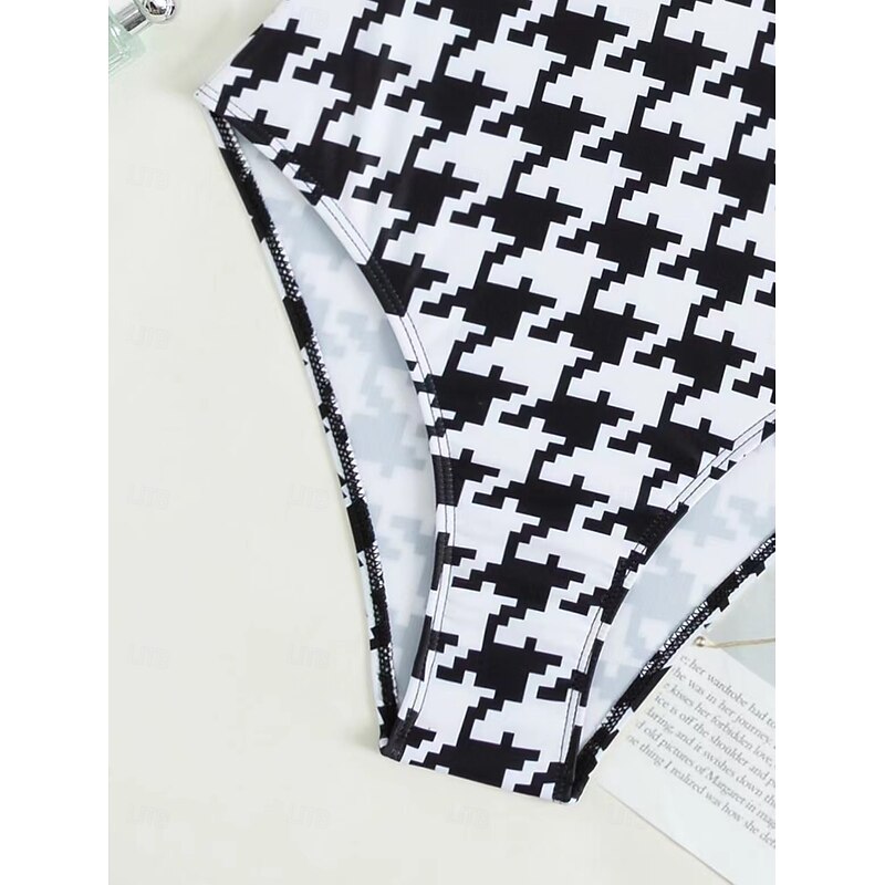 Featuring a halter neck, the swimsuit is equipped with padded, underwired bras for bust support and enhancement. The adjustable shoulder straps allow for a customizable fit, while the backless design adds a touch of allure. The classic black and white houndstooth pattern offers timeless elegance combined with modern chic.