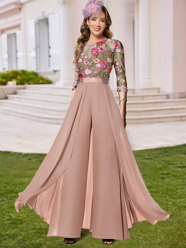 More information about FloralJumpsuits Embroidered Formal Column Mother of the Bride Wedding Elegant Illusion Neck Floor Length Chiffon 3/4 Length Sleeve with Solid Color Race Day Dress