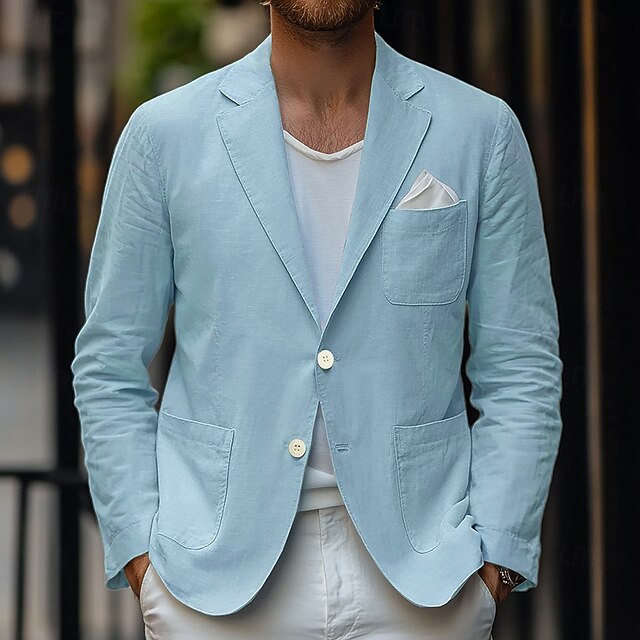 Men's Linen Blazer Sport Coat Casual Daily Spring & Summer Cotton And Linen Solid Color Comfy Single Breasted Two-button Blazer Beige Light Blue 12
